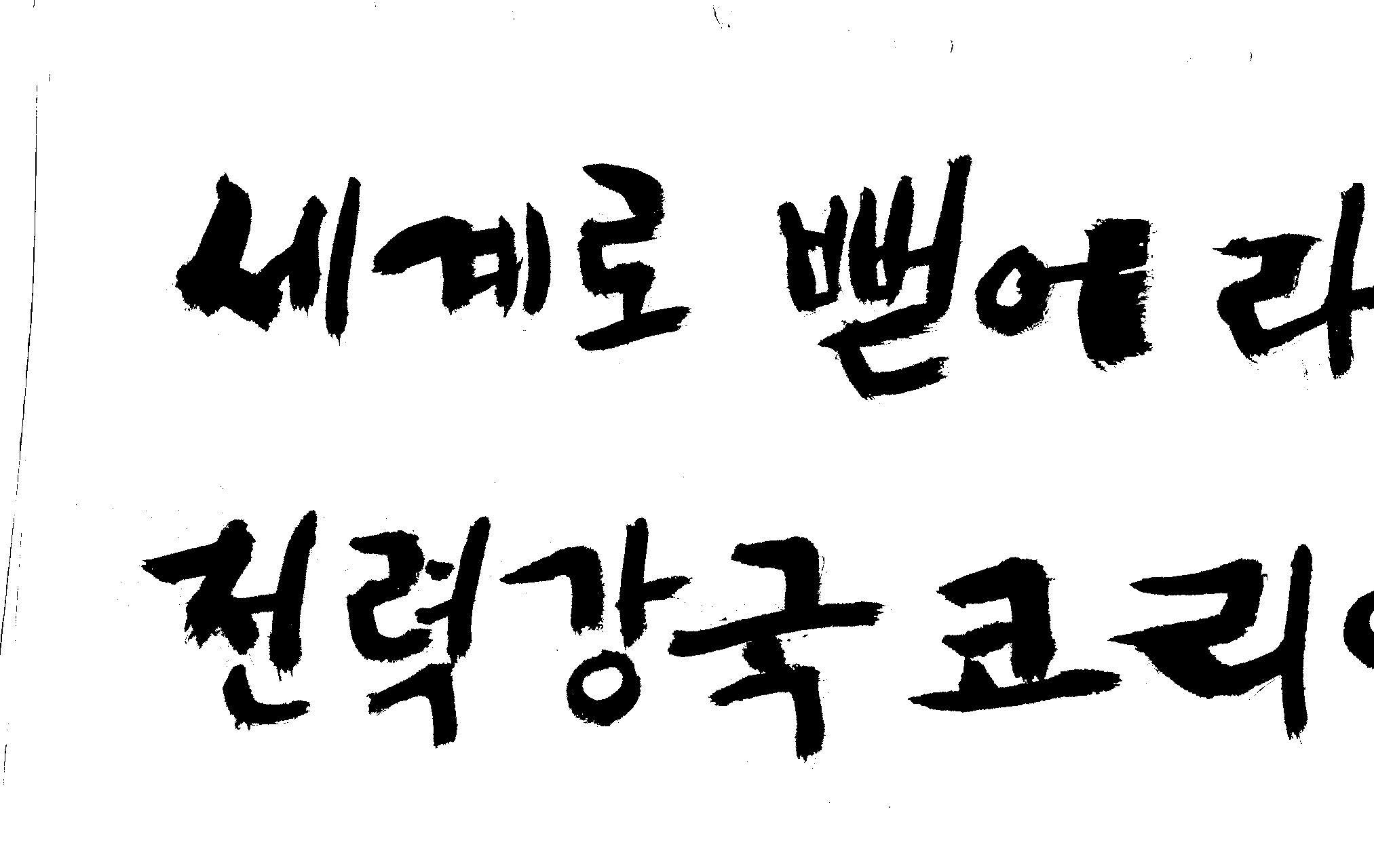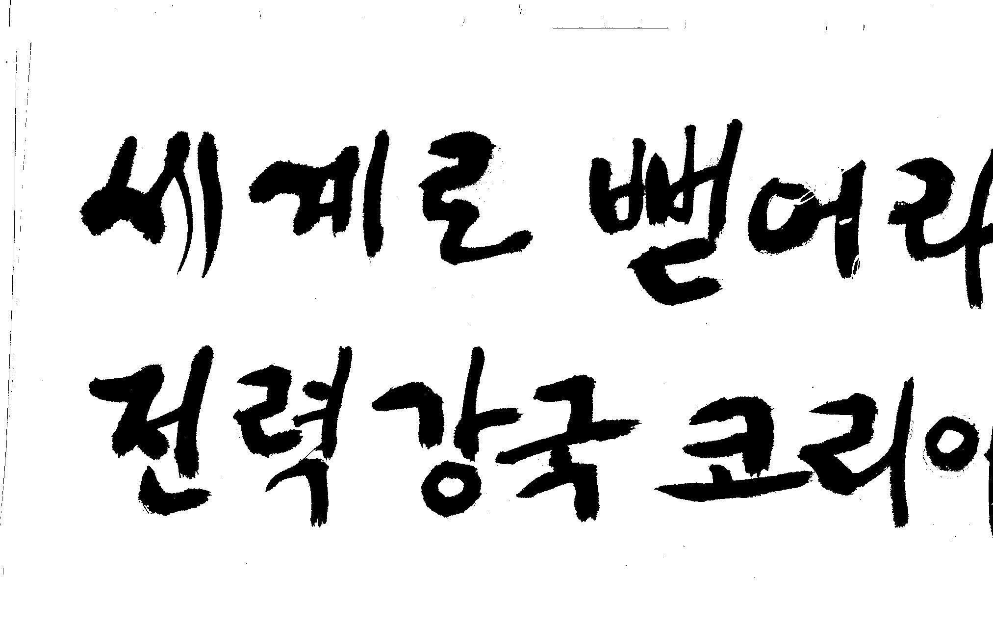 캘리 좀 부탁드려요!~ 김철호 일반 1 12732 2008.12.24 12:09 > > > > > > > > > 전력회사 신문광고를 하는데요 캘리로 멋지게 하고픈데 > > > 캘리프로그램으로 아무리 써도 느낌이 안나옵니다 ㅜ.ㅜ > > > 이런걸 부탁한다는 자체가 너무나도 염치없지만 부탁드립니다. > > > > > > 세계로 뻗어라! 전력강국 코리아 > > > > > 보기는 쉬워도 하기는 어려운게 > > 세상 모든 일 일겁니다. > > 그중에 캘리그라피가 그런 것일 겁니다... > > 스캔중에 글꼴이 잘린것은 서로다른글꼴서 편집하시길... > > 글수가 많아서 어쩔 수없네요... > > >